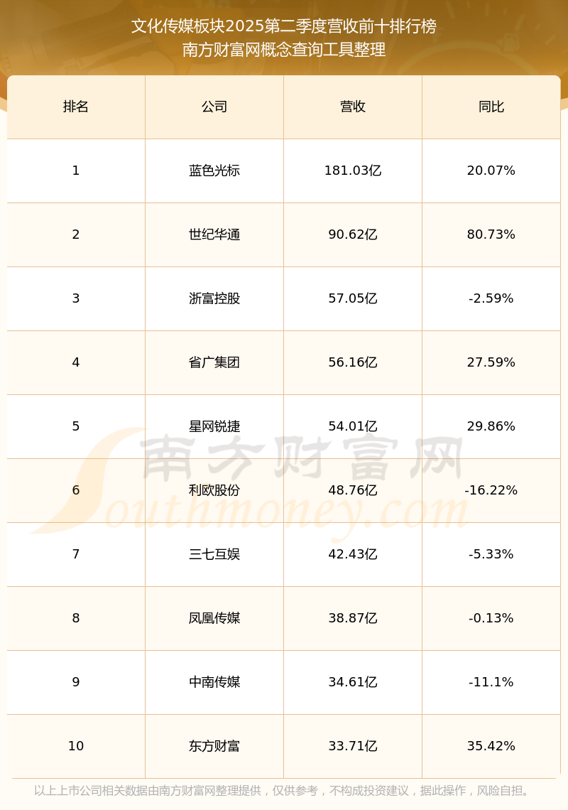 按照南方財(cái)富網(wǎng)概念查詢工具統(tǒng)計(jì),該股所屬板塊為文化傳媒板塊,該板塊共有240只股票,浙文互聯(lián)2025第二季度營收在該板塊中排名為第38名,該板塊2025第二季度營收排名前十的股票如下表: