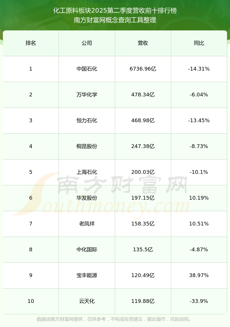 按照南方財富網(wǎng)概念查詢工具統(tǒng)計,該股所屬板塊為化工原料板塊,該板塊共有123只股票,巨化股份2025第二季度營收在該板塊中排名為第16名,該板塊2025第二季度營收排名前十的股票如下表: