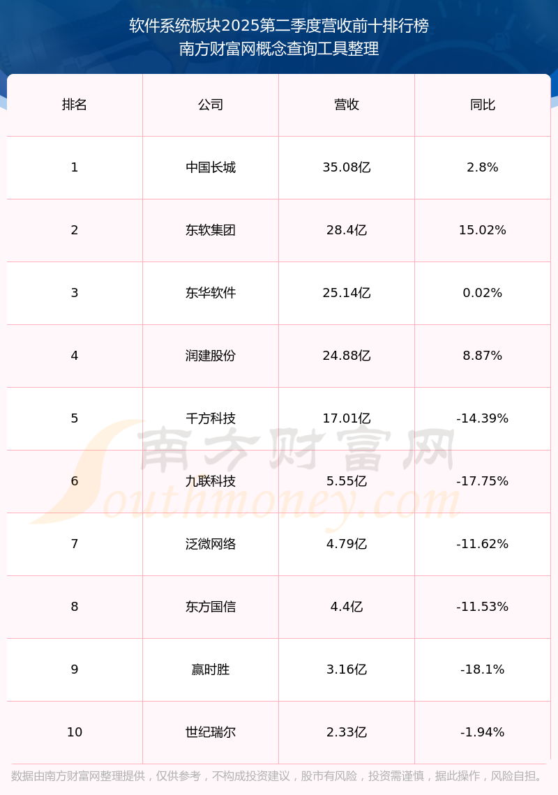 按照南方財富網(wǎng)概念查詢工具統(tǒng)計,該股所屬板塊為軟件系統(tǒng)板塊,該板塊共有22只股票,永安行2025第二季度營收在該板塊中排名為第22名,該板塊2025第二季度營收排名前十的股票如下表: