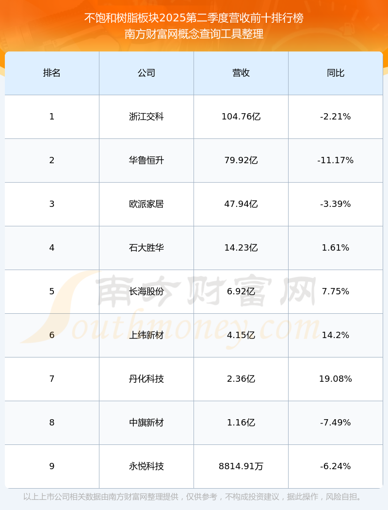 按照南方財富網(wǎng)概念查詢工具統(tǒng)計,該股所屬板塊為不飽和樹脂板塊,該板塊共有9只股票,永悅科技2025第二季度營收在該板塊中排名為第9名,該板塊2025第二季度營收排名前十的股票如下表: