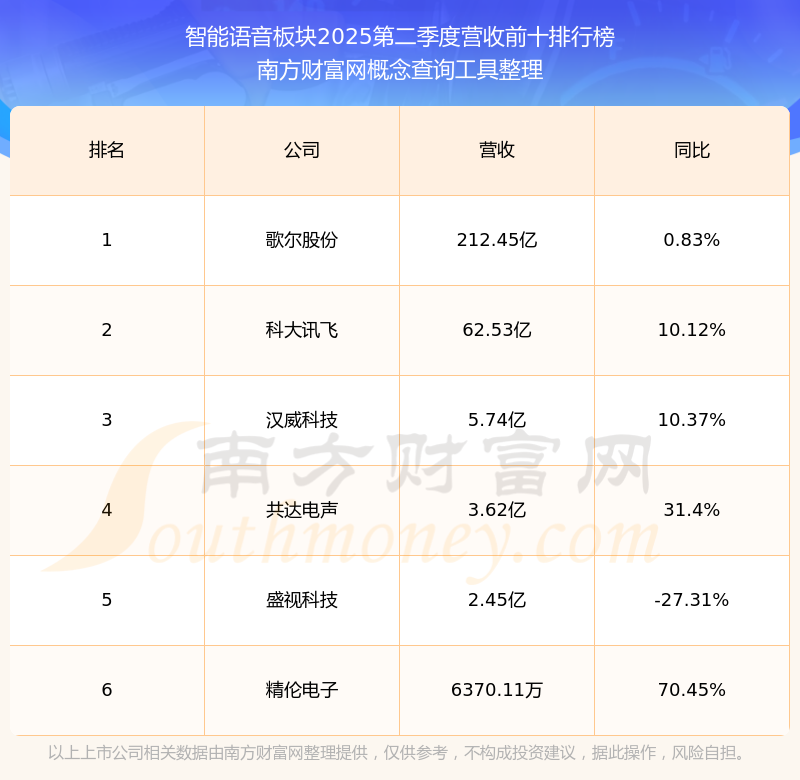 按照南方財(cái)富網(wǎng)概念查詢工具統(tǒng)計(jì),該股所屬板塊為智能語音板塊,該板塊共有6只股票,海天瑞聲2025第二季度營(yíng)收在該板塊中排名為第6名,該板塊2025第二季度營(yíng)收排名前十的股票如下表: