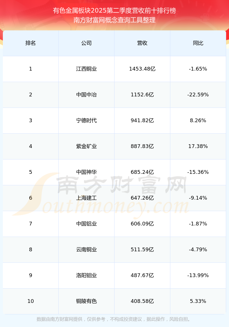 按照南方財(cái)富網(wǎng)概念查詢(xún)工具統(tǒng)計(jì),該股所屬板塊為有色金屬板塊,該板塊共有289只股票,中國(guó)鋁業(yè)2025第二季度營(yíng)收在該板塊中排名為第7名,該板塊2025第二季度營(yíng)收排名前十的股票如下表: