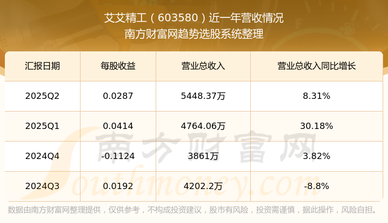 艾艾精工2025年第二季度顯示,公司主營收入5448.37萬元,同比8.31%;歸母凈利潤375.47萬元,同比78.33%;扣非凈利潤328.83萬元,同比77.62%。