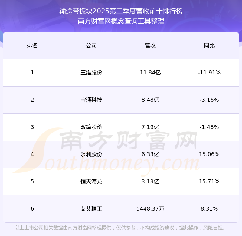 按照南方財(cái)富網(wǎng)概念查詢工具統(tǒng)計(jì),該股所屬板塊為輸送帶板塊,該板塊共有6只股票,艾艾精工2025第二季度營收在該板塊中排名為第6名,該板塊2025第二季度營收排名前十的股票如下表: