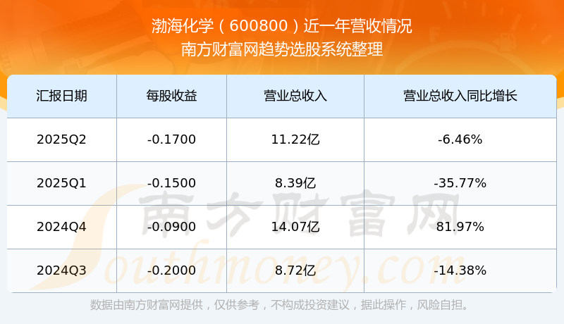 A股上市公司渤;瘜W(xué)(代碼:600800)發(fā)布2025年第二季度財(cái)報(bào),公司2025年第二季度歸屬于上市公司股東的凈利潤(rùn)為-1.9億元,凈利潤(rùn)同比增長(zhǎng)-37.38%,環(huán)比增長(zhǎng)-12.36%。