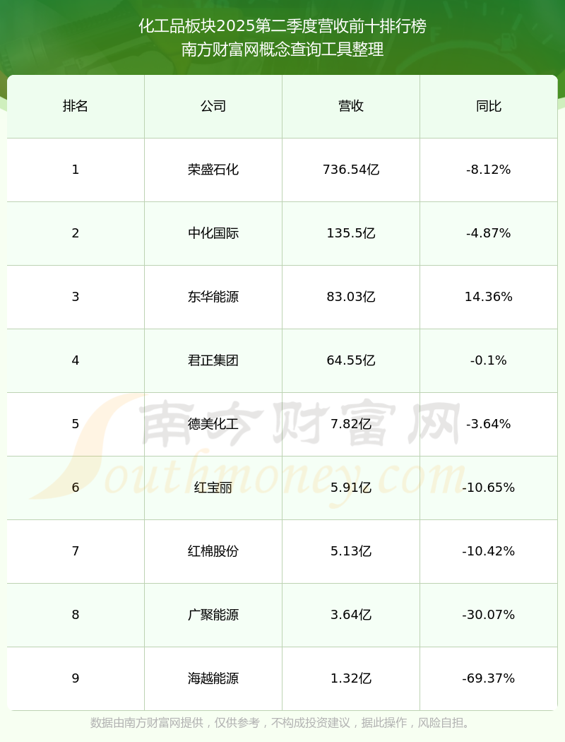 按照南方財(cái)富網(wǎng)概念查詢工具統(tǒng)計(jì),該股所屬板塊為化工品板塊,該板塊共有9只股票,渤;瘜W(xué)2025第二季度營(yíng)收在該板塊中排名為第9名,該板塊2025第二季度營(yíng)收排名前十的股票如下表: