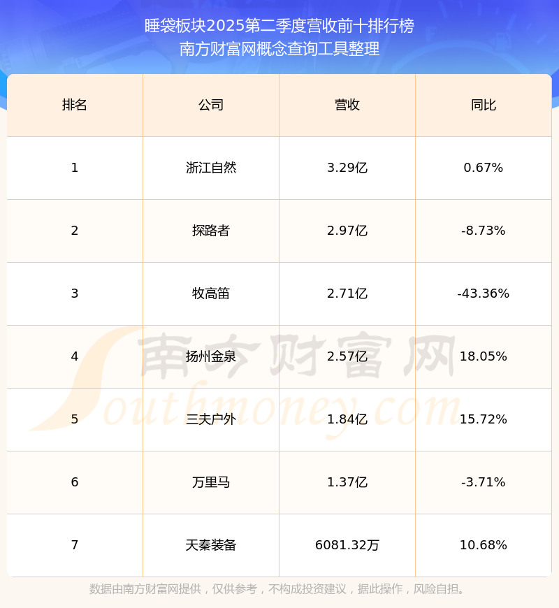 按照南方財富網概念查詢工具統(tǒng)計,該股所屬板塊為睡袋板塊,該板塊共有7只股票,揚州金泉2025第二季度營收在該板塊中排名為第4名,該板塊2025第二季度營收排名前十的股票如下表: