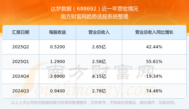 達(dá)夢數(shù)據(jù)2025年第二季度公司實現(xiàn)營業(yè)收入2.65億元,同比42.44%;歸母凈利潤1.07億元,同比124.08%。