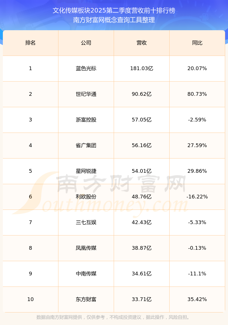 按照南方財(cái)富網(wǎng)概念查詢工具統(tǒng)計(jì),該股所屬板塊為文化傳媒板塊,該板塊共有240只股票,鳳凰傳媒2025第二季度營收在該板塊中排名為第8名,該板塊2025第二季度營收排名前十的股票如下表: