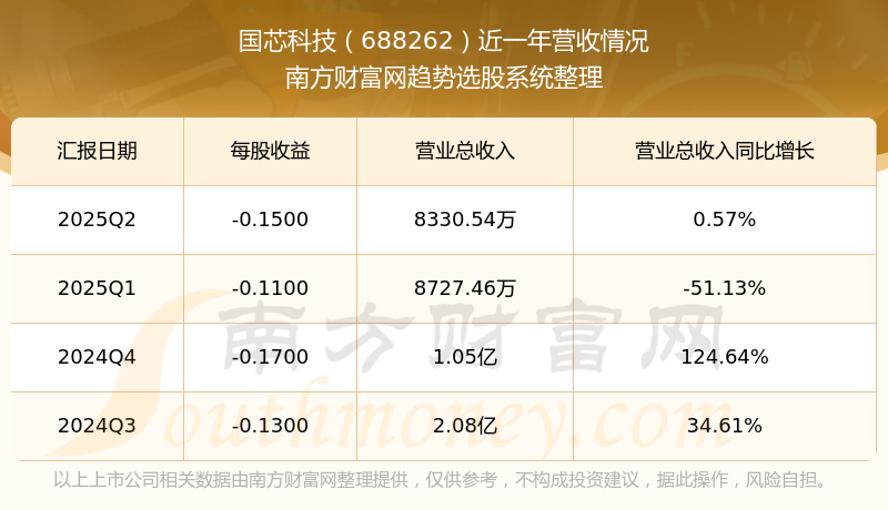 在2025年第二季度,國芯科技的業(yè)績表現(xiàn),主營業(yè)務(wù)收入達(dá)到8330.54萬元,實現(xiàn)了0.57%的同比增長率。同時,公司歸母凈利潤錄得-5166.06萬元,同比增長-42.66%。
