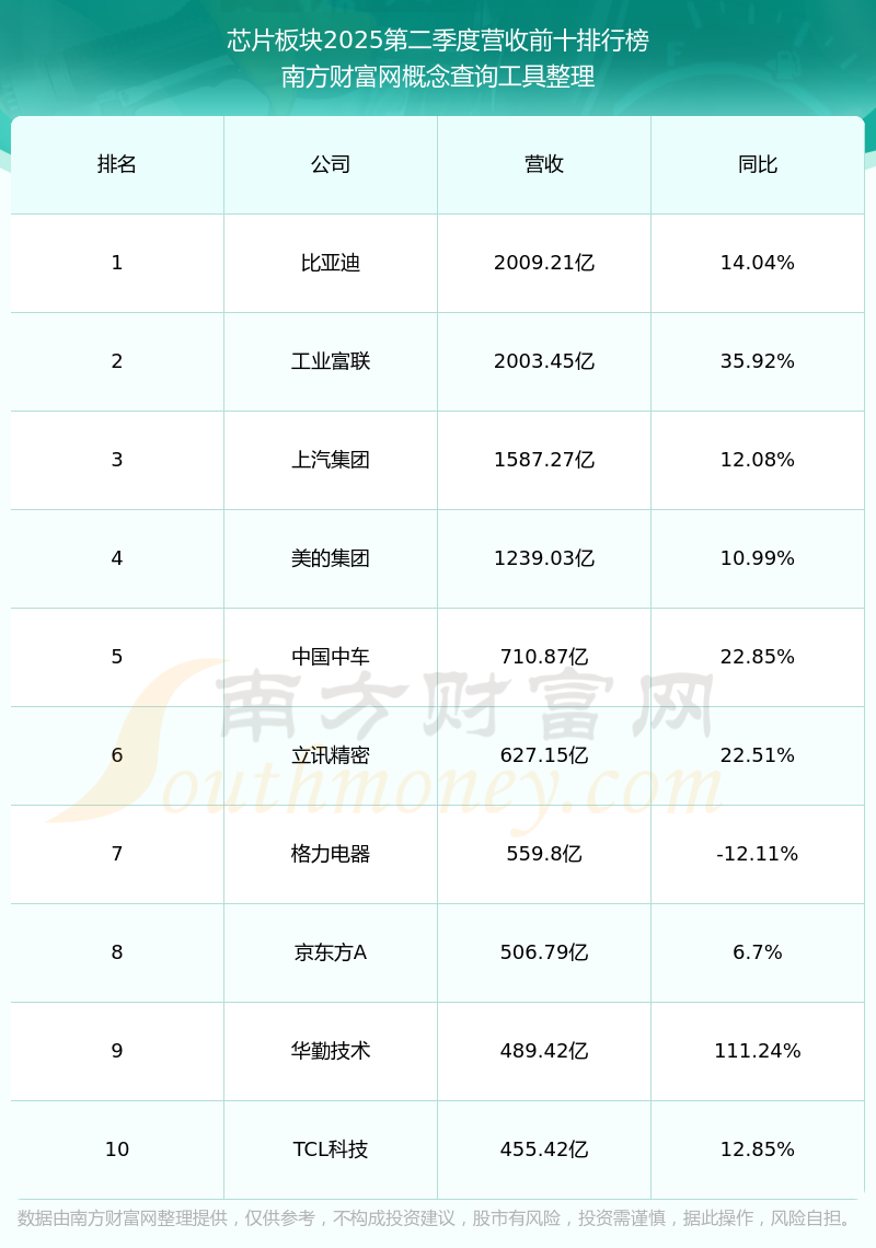 按照南方財富網(wǎng)概念查詢工具統(tǒng)計,該股所屬板塊為芯片板塊,該板塊共有913只股票,國芯科技2025第二季度營收在該板塊中排名為第856名,該板塊2025第二季度營收排名前十的股票如下表: