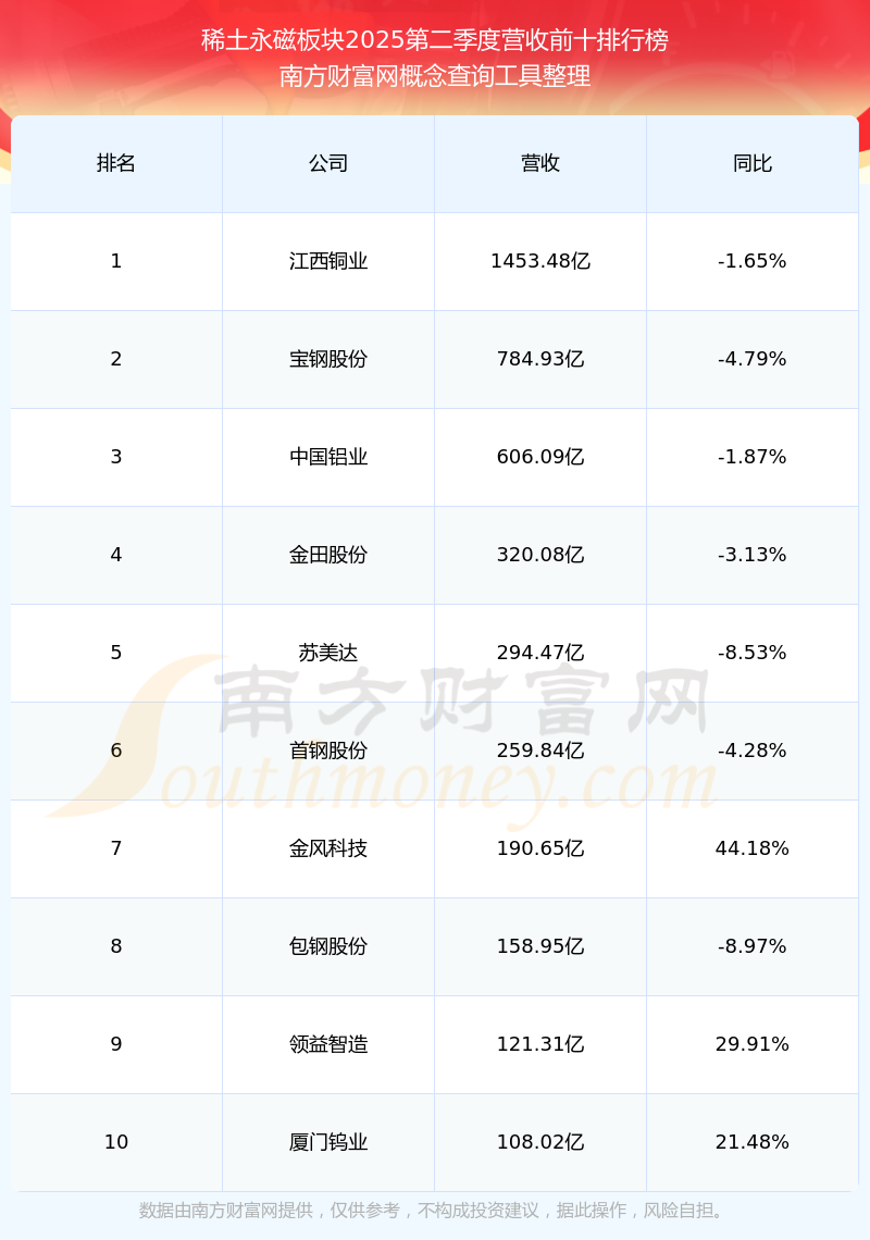 按照南方財富網(wǎng)概念查詢工具統(tǒng)計,該股所屬板塊為稀土永磁板塊,該板塊共有99只股票,科力遠2025第二季度營收在該板塊中排名為第49名,該板塊2025第二季度營收排名前十的股票如下表: