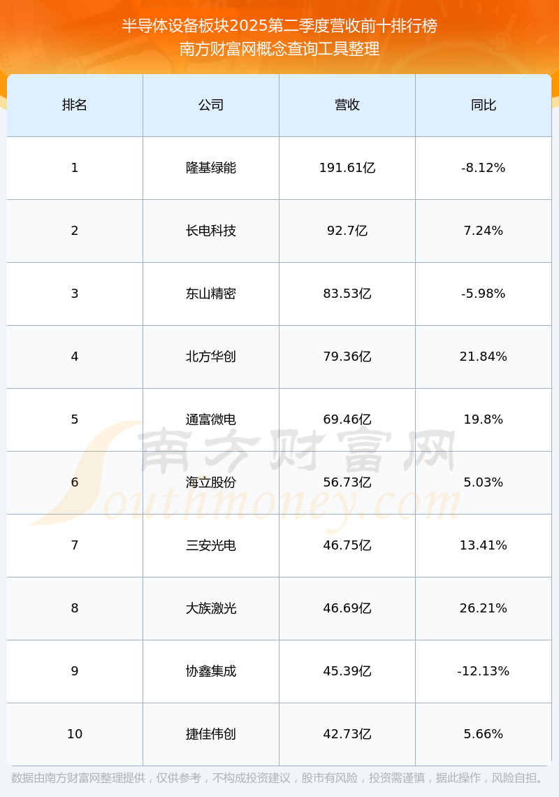 按照南方財(cái)富網(wǎng)概念查詢工具統(tǒng)計(jì),該股所屬板塊為半導(dǎo)體設(shè)備板塊,該板塊共有168只股票,屹唐股份2025第二季度營(yíng)收在該板塊中排名為第33名,該板塊2025第二季度營(yíng)收排名前十的股票如下表: