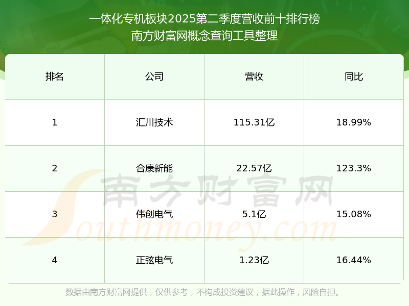 按照南方財(cái)富網(wǎng)概念查詢工具統(tǒng)計(jì),該股所屬板塊為一體化專機(jī)板塊,該板塊共有4只股票,正弦電氣2025第二季度營(yíng)收在該板塊中排名為第4名,該板塊2025第二季度營(yíng)收排名前十的股票如下表: