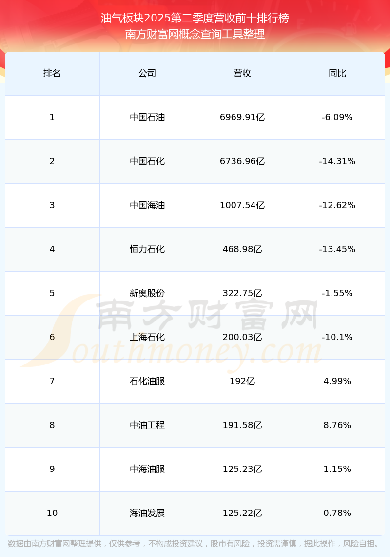 按照南方財富網(wǎng)概念查詢工具統(tǒng)計,該股所屬板塊為油氣板塊,該板塊共有48只股票,中國海油2025第二季度營收在該板塊中排名為第3名,該板塊2025第二季度營收排名前十的股票如下表: