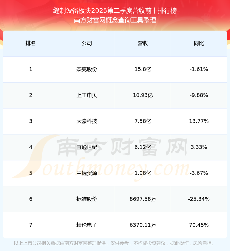 按照南方財富網(wǎng)概念查詢工具統(tǒng)計,該股所屬板塊為縫制設(shè)備板塊,該板塊共有7只股票,上工申貝2025第二季度營收在該板塊中排名為第2名,該板塊2025第二季度營收排名前十的股票如下表: