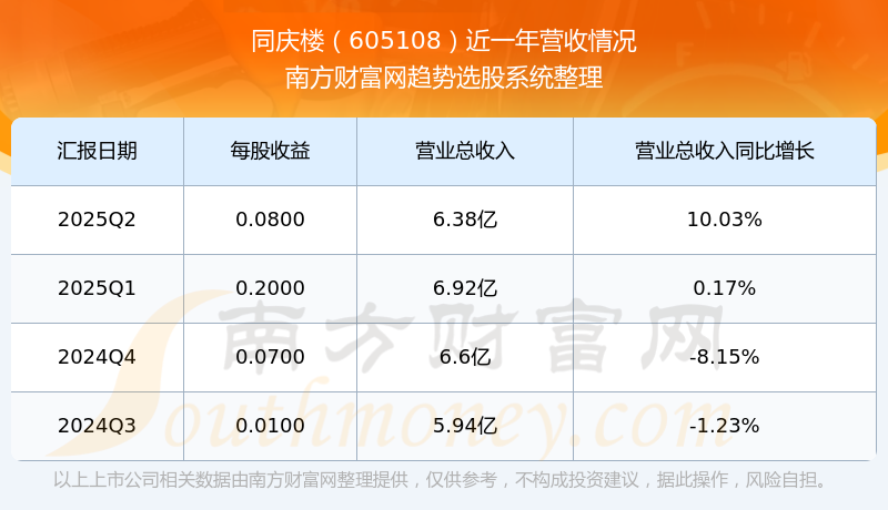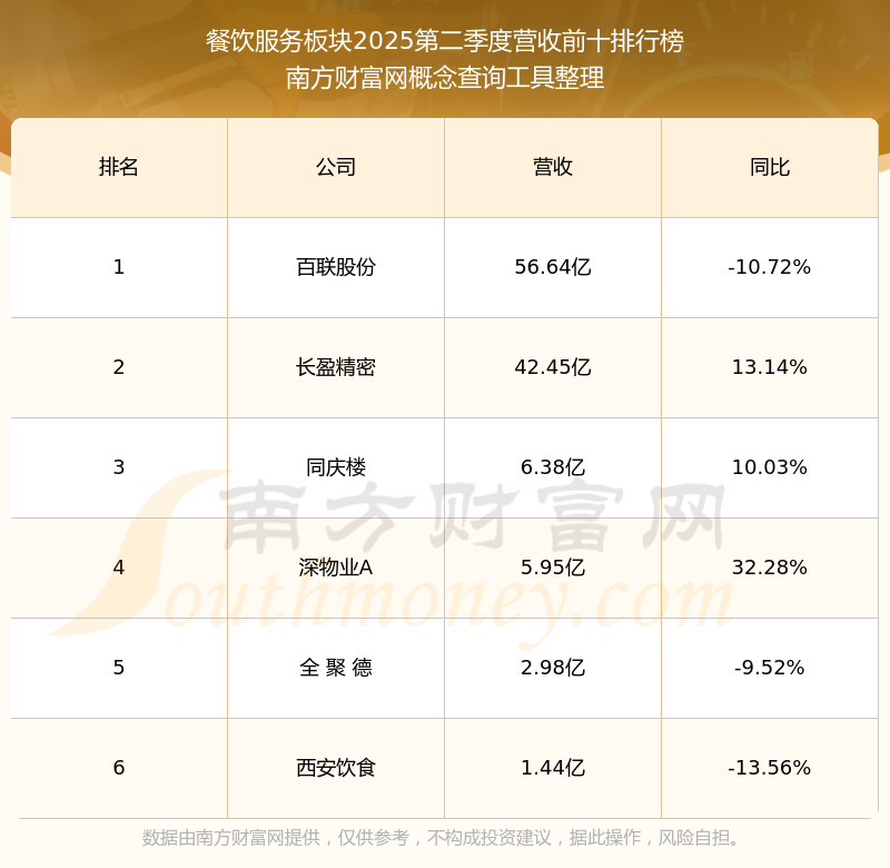 按照南方財富網(wǎng)概念查詢工具統(tǒng)計,該股所屬板塊為餐飲服務板塊,該板塊共有6只股票,同慶樓2025第二季度營收在該板塊中排名為第3名,該板塊2025第二季度營收排名前十的股票如下表: