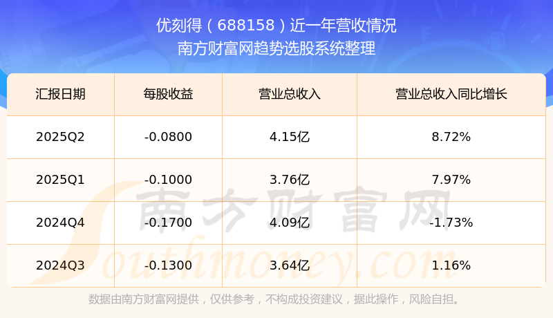 在2025年第二季度,優(yōu)刻得的業(yè)績表現(xiàn),主營業(yè)務(wù)收入達(dá)到4.15億元,實(shí)現(xiàn)了8.72%的同比增長率。同時,公司歸母凈利潤錄得-3491.58萬元,同比增長25.03%。