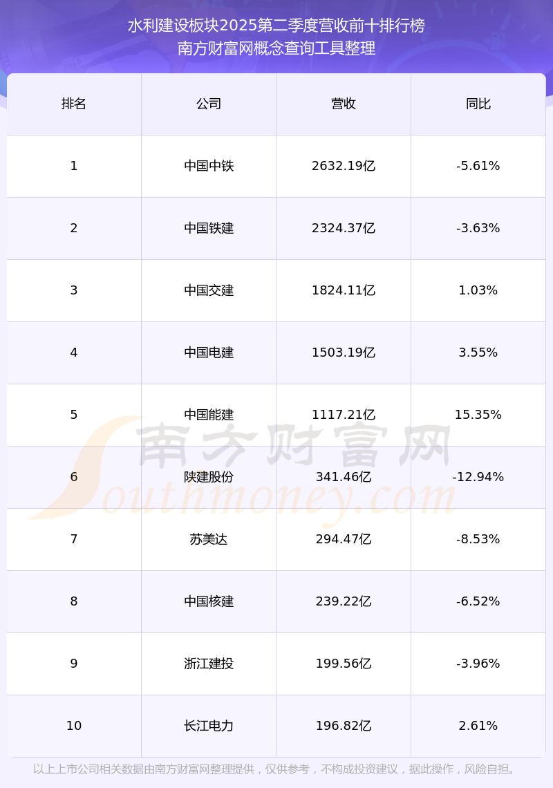 按照南方財(cái)富網(wǎng)概念查詢工具統(tǒng)計(jì),該股所屬板塊為水利建設(shè)板塊,該板塊共有137只股票,銀龍股份2025第二季度營(yíng)收在該板塊中排名為第59名,該板塊2025第二季度營(yíng)收排名前十的股票如下表: