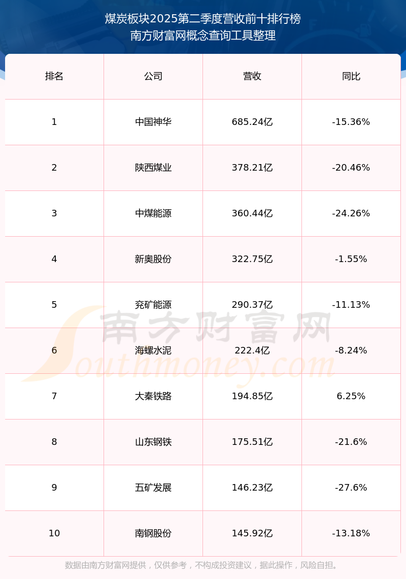 按照南方財富網(wǎng)概念查詢工具統(tǒng)計,該股所屬板塊為煤炭板塊,該板塊共有71只股票,華陽股份2025第二季度營收在該板塊中排名為第27名,該板塊2025第二季度營收排名前十的股票如下表: