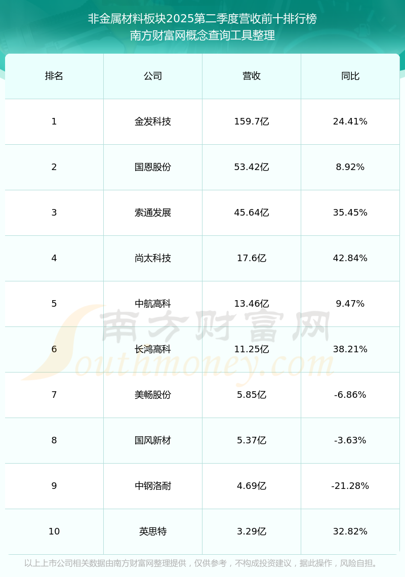 按照南方財富網(wǎng)概念查詢工具統(tǒng)計,該股所屬板塊為非金屬材料板塊,該板塊共有23只股票,魯信創(chuàng)投2025第二季度營收在該板塊中排名為第23名,該板塊2025第二季度營收排名前十的股票如下表: