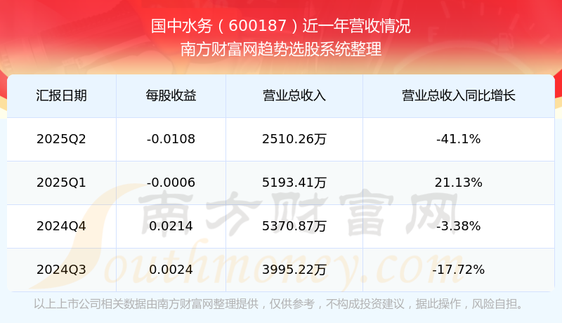 財報顯示,2025年第二季度國中水務(wù)營收2510.26萬元,同比增長-41.1%,凈利潤-1729.46萬元,同比增長-638.32%。