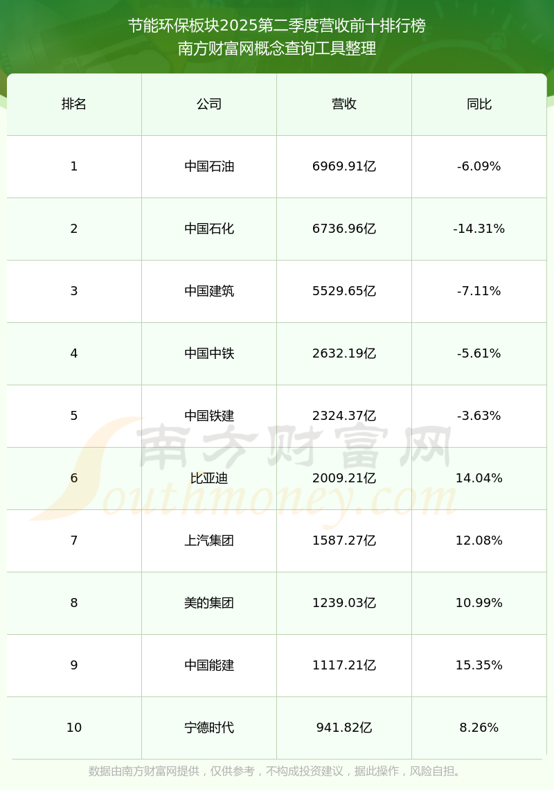按照南方財富網(wǎng)概念查詢工具統(tǒng)計,該股所屬板塊為節(jié)能環(huán)保板塊,該板塊共有621只股票,國中水務(wù)2025第二季度營收在該板塊中排名為第609名,該板塊2025第二季度營收排名前十的股票如下表:
