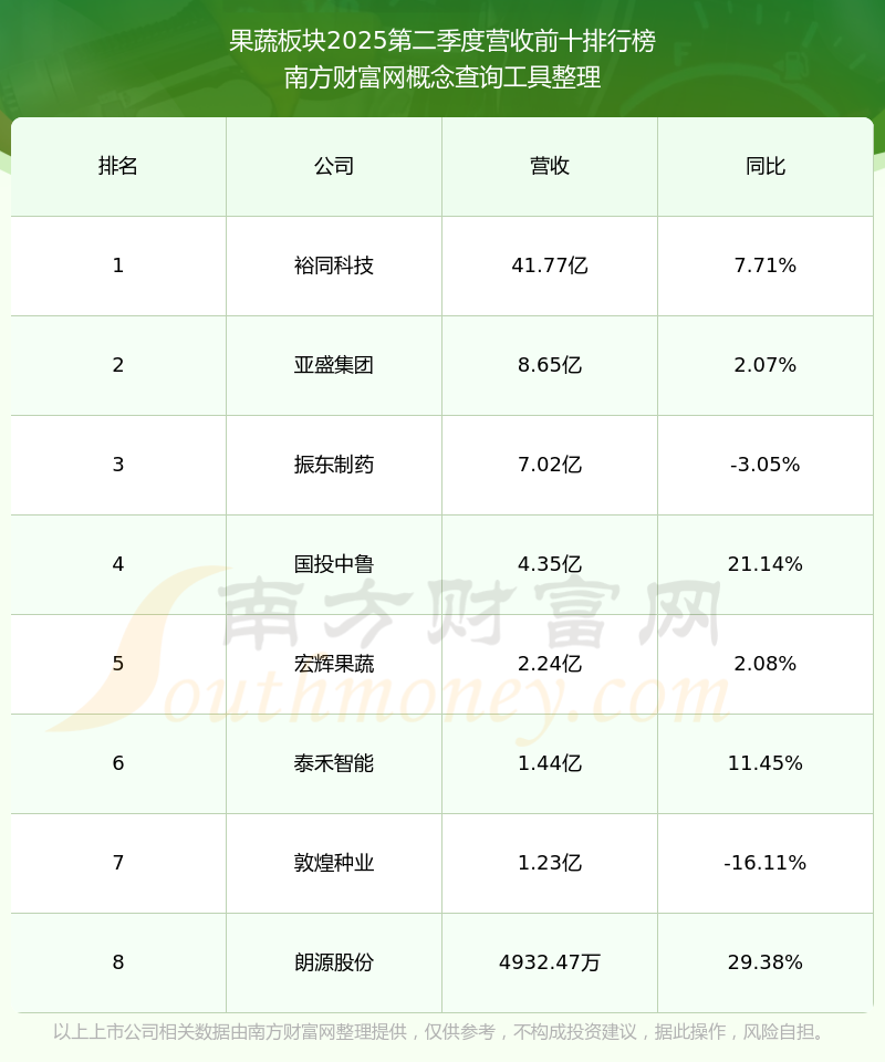 按照南方財(cái)富網(wǎng)概念查詢工具統(tǒng)計(jì),該股所屬板塊為果蔬板塊,該板塊共有8只股票,來伊份2025第二季度營收在該板塊中排名為第8名,該板塊2025第二季度營收排名前十的股票如下表: