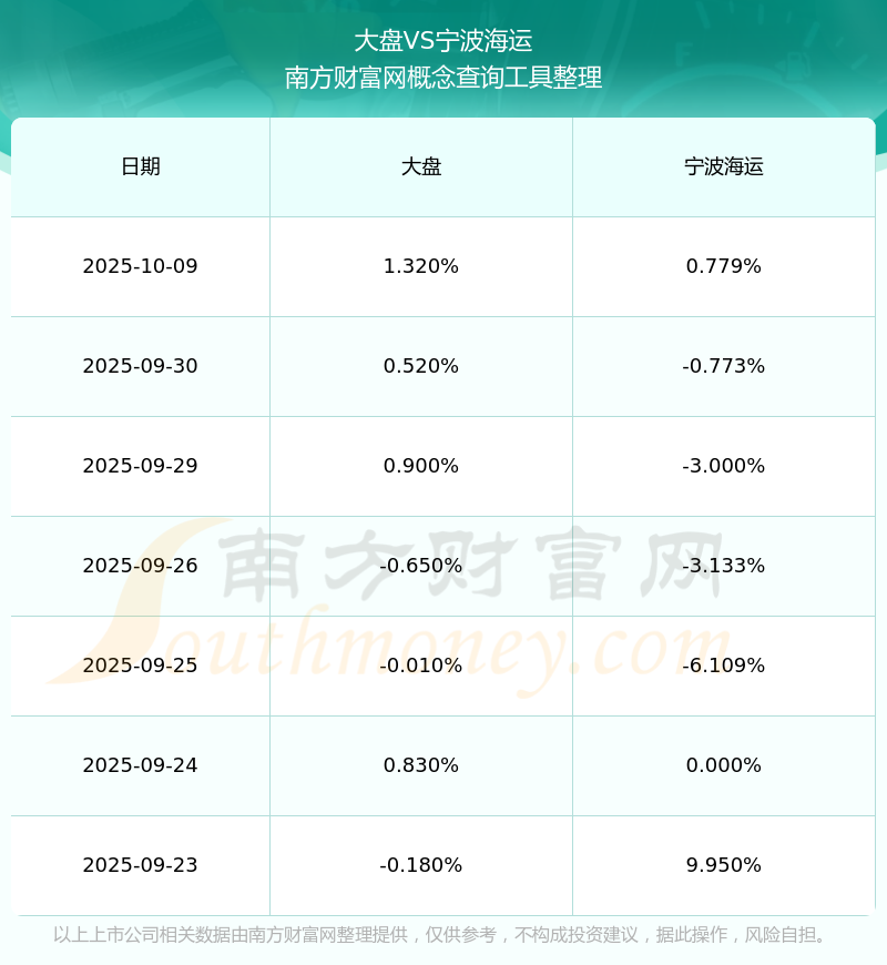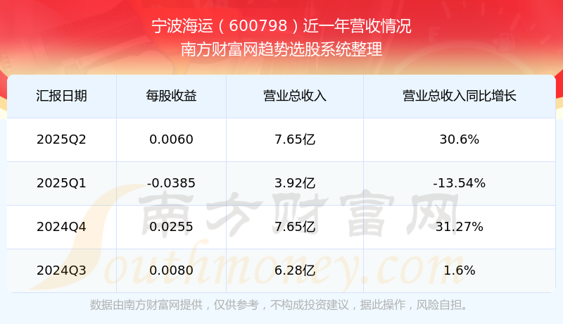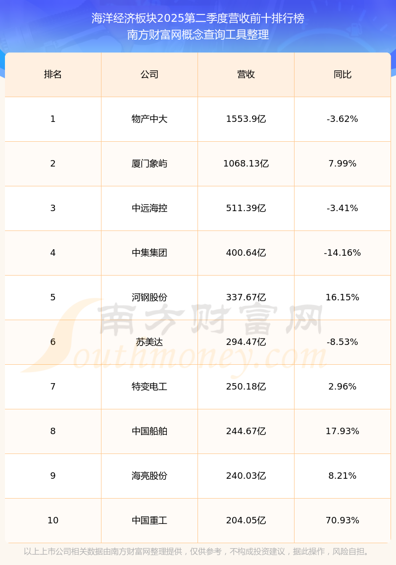 按照南方財(cái)富網(wǎng)概念查詢工具統(tǒng)計(jì),該股所屬板塊為海洋經(jīng)濟(jì)板塊,該板塊共有145只股票,寧波海運(yùn)2025第二季度營收在該板塊中排名為第71名,該板塊2025第二季度營收排名前十的股票如下表: