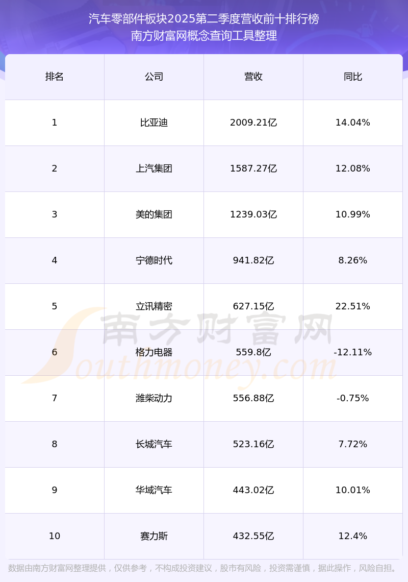 按照南方財(cái)富網(wǎng)概念查詢工具統(tǒng)計(jì),該股所屬板塊為汽車零部件板塊,該板塊共有567只股票,星宇股份2025第二季度營收在該板塊中排名為第69名,該板塊2025第二季度營收排名前十的股票如下表: