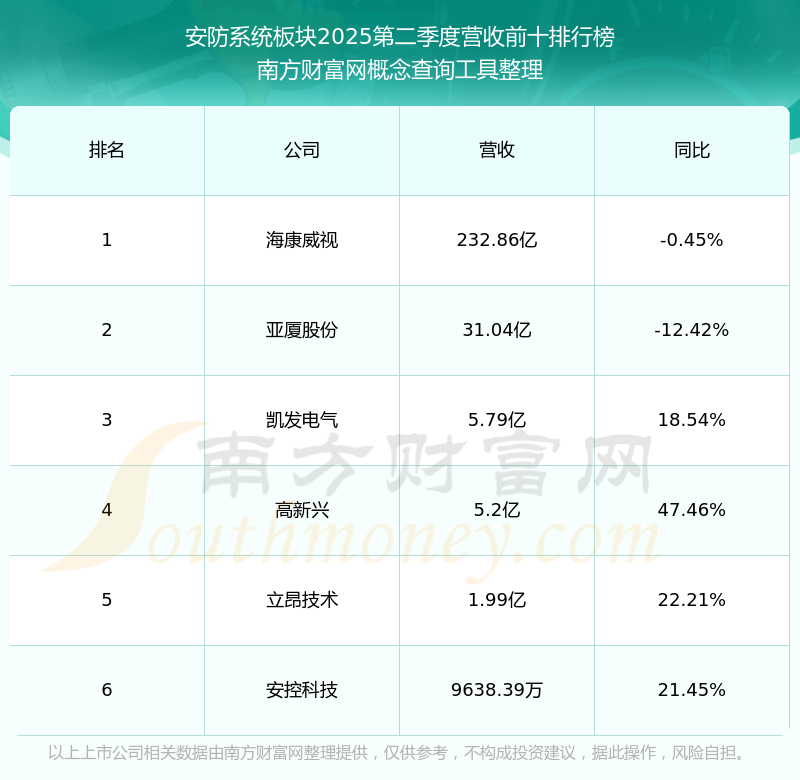 按照南方財富網(wǎng)概念查詢工具統(tǒng)計,該股所屬板塊為安防系統(tǒng)板塊,該板塊共有6只股票,實達(dá)集團(tuán)2025第二季度營收在該板塊中排名為第6名,該板塊2025第二季度營收排名前十的股票如下表:
