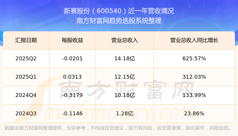 新賽股份2025年第二季度顯示,公司主營(yíng)收入14.18億元,同比625.57%;歸母凈利潤(rùn)-1167.35萬(wàn)元,同比-482.64%;扣非凈利潤(rùn)-3968.85萬(wàn)元,同比-142.94%。