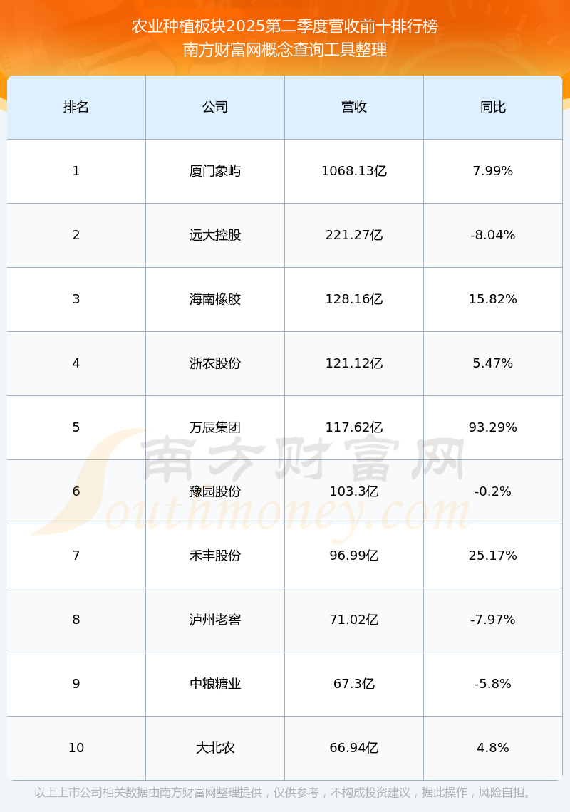 按照南方財(cái)富網(wǎng)概念查詢工具統(tǒng)計(jì),該股所屬板塊為農(nóng)業(yè)種植板塊,該板塊共有94只股票,新賽股份2025第二季度營(yíng)收在該板塊中排名為第33名,該板塊2025第二季度營(yíng)收排名前十的股票如下表: