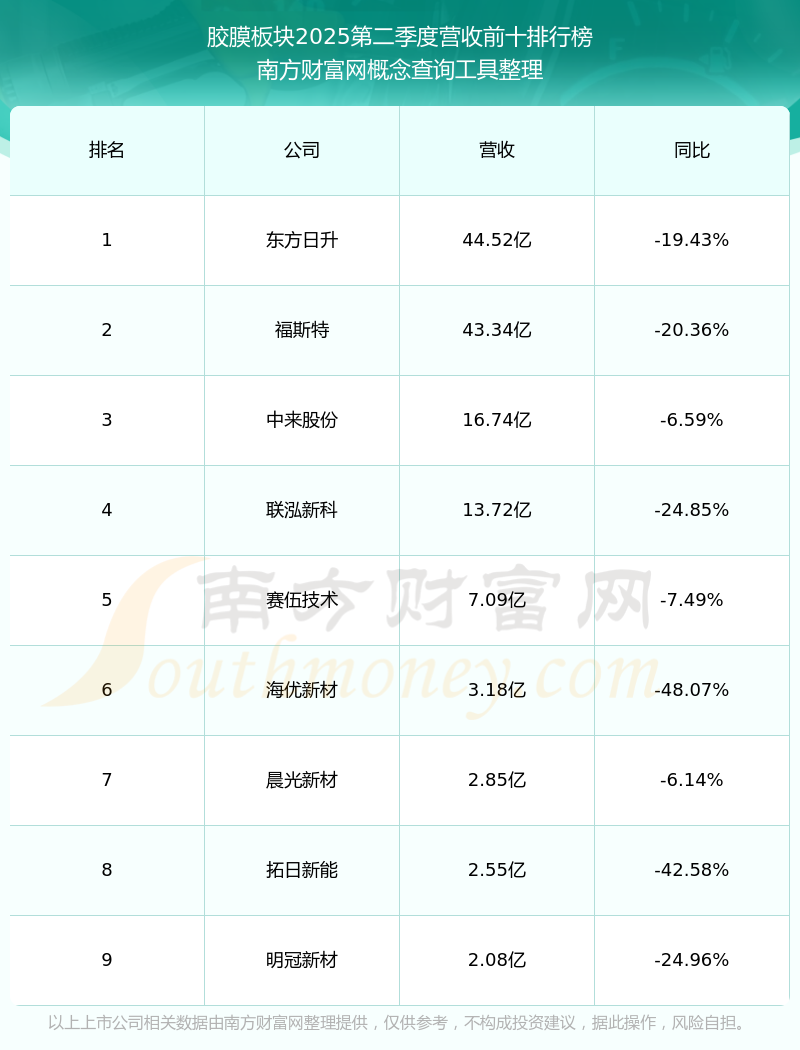 按照南方財富網(wǎng)概念查詢工具統(tǒng)計,該股所屬板塊為膠膜板塊,該板塊共有9只股票,賽伍技術(shù)2025第二季度營收在該板塊中排名為第5名,該板塊2025第二季度營收排名前十的股票如下表: