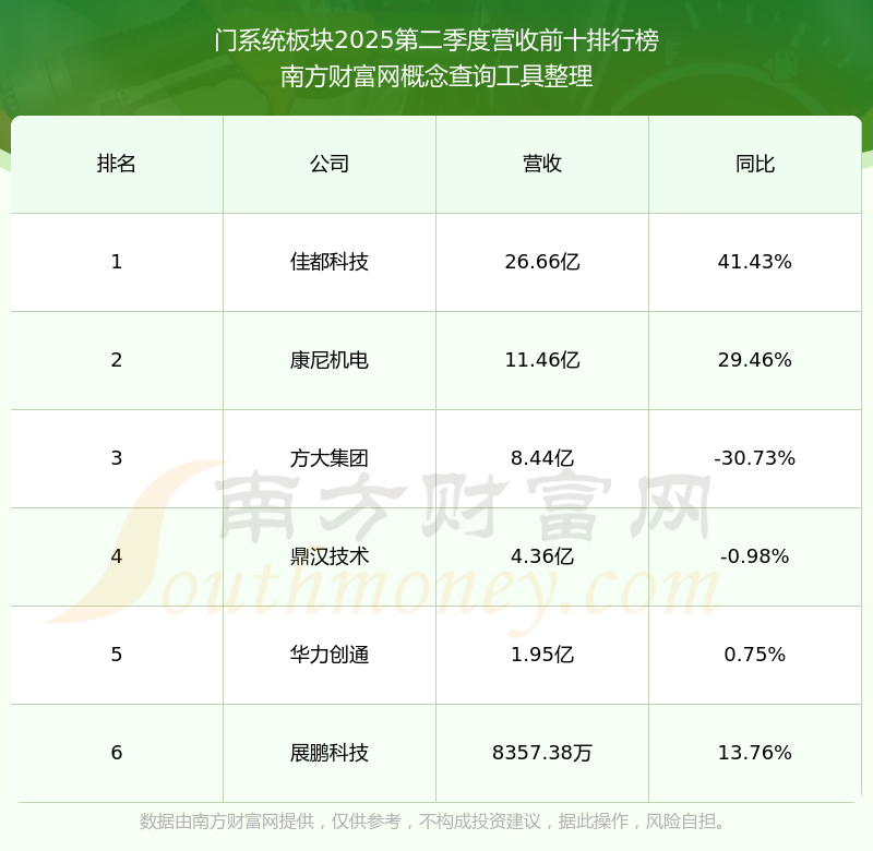 按照南方財富網(wǎng)概念查詢工具統(tǒng)計,該股所屬板塊為門系統(tǒng)板塊,該板塊共有6只股票,康尼機電2025第二季度營收在該板塊中排名為第2名,該板塊2025第二季度營收排名前十的股票如下表: