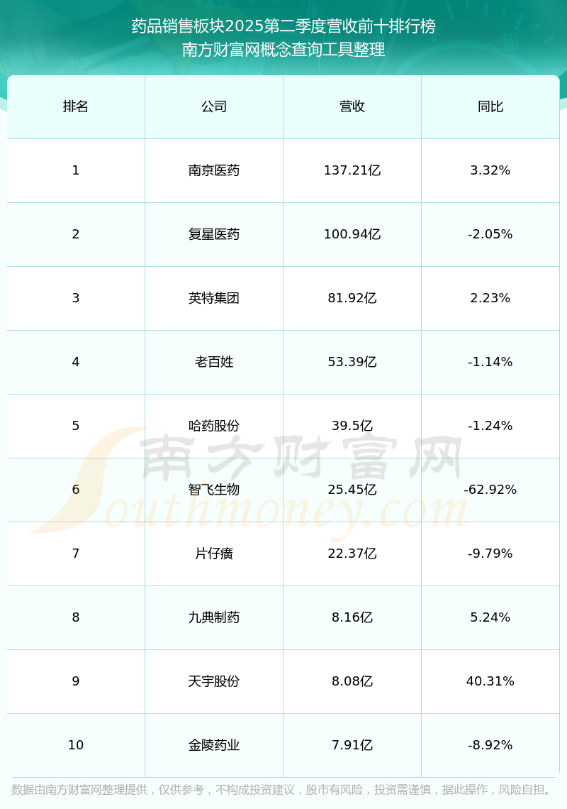 按照南方財富網(wǎng)概念查詢工具統(tǒng)計,該股所屬板塊為藥品銷售板塊,該板塊共有18只股票,諾誠健華2025第二季度營收在該板塊中排名為第18名,該板塊2025第二季度營收排名前十的股票如下表:
