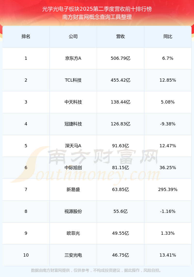 按照南方財(cái)富網(wǎng)概念查詢工具統(tǒng)計(jì),該股所屬板塊為光學(xué)光電子板塊,該板塊共有133只股票,華體科技2025第二季度營(yíng)收在該板塊中排名為第124名,該板塊2025第二季度營(yíng)收排名前十的股票如下表: