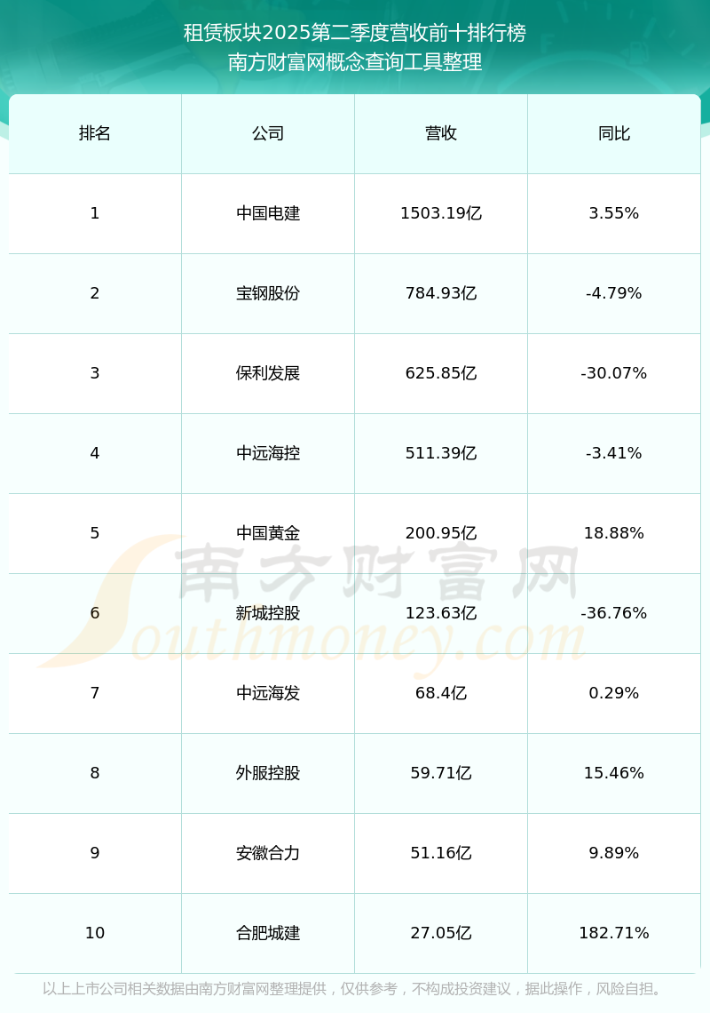 按照南方財(cái)富網(wǎng)概念查詢工具統(tǒng)計(jì),該股所屬板塊為租賃板塊,該板塊共有31只股票,海通發(fā)展2025第二季度營(yíng)收在該板塊中排名為第31名,該板塊2025第二季度營(yíng)收排名前十的股票如下表: