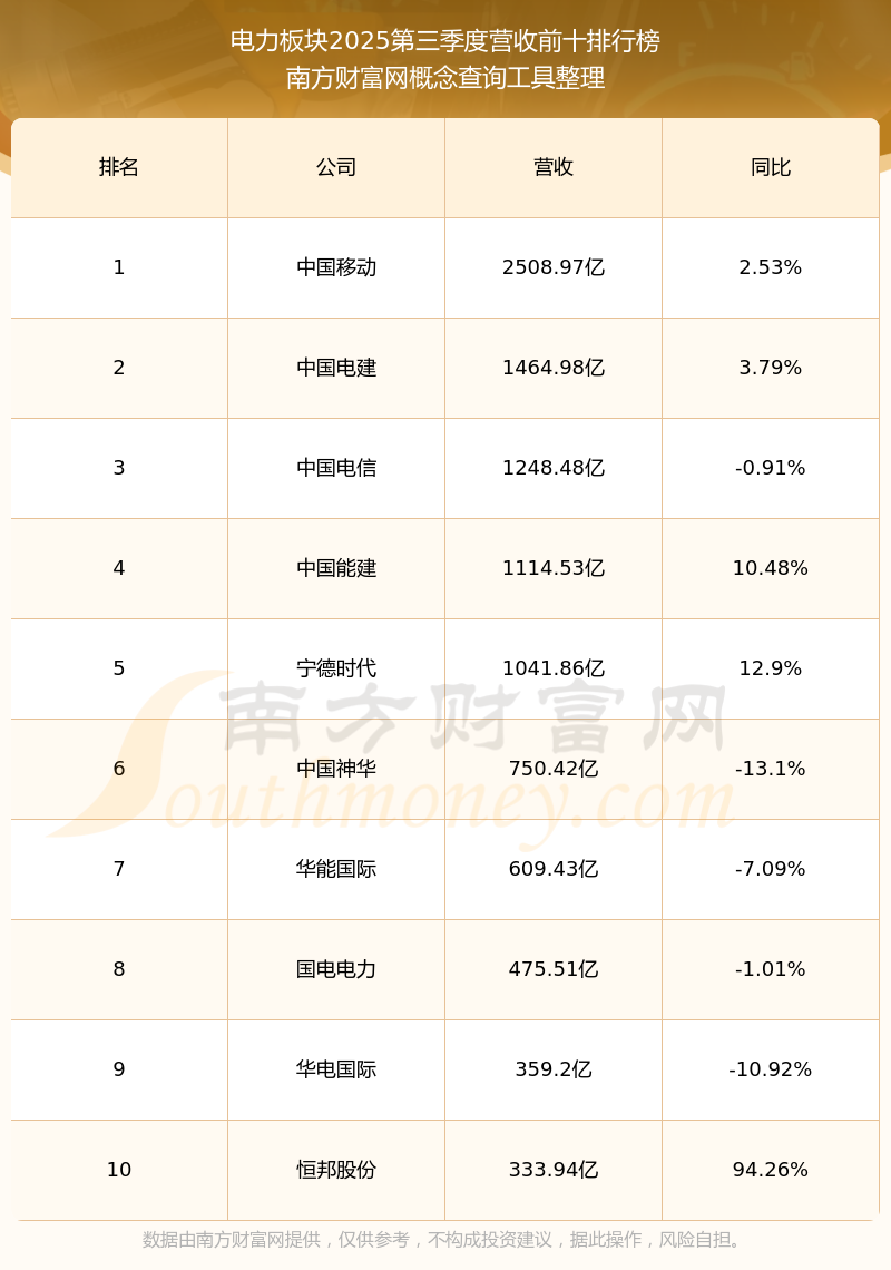 按照南方財富網(wǎng)概念查詢工具統(tǒng)計,該股所屬板塊為電力板塊,該板塊共有237只股票,國投電力2025第三季度營收在該板塊中排名為第26名,該板塊2025第三季度營收排名前十的股票如下表: