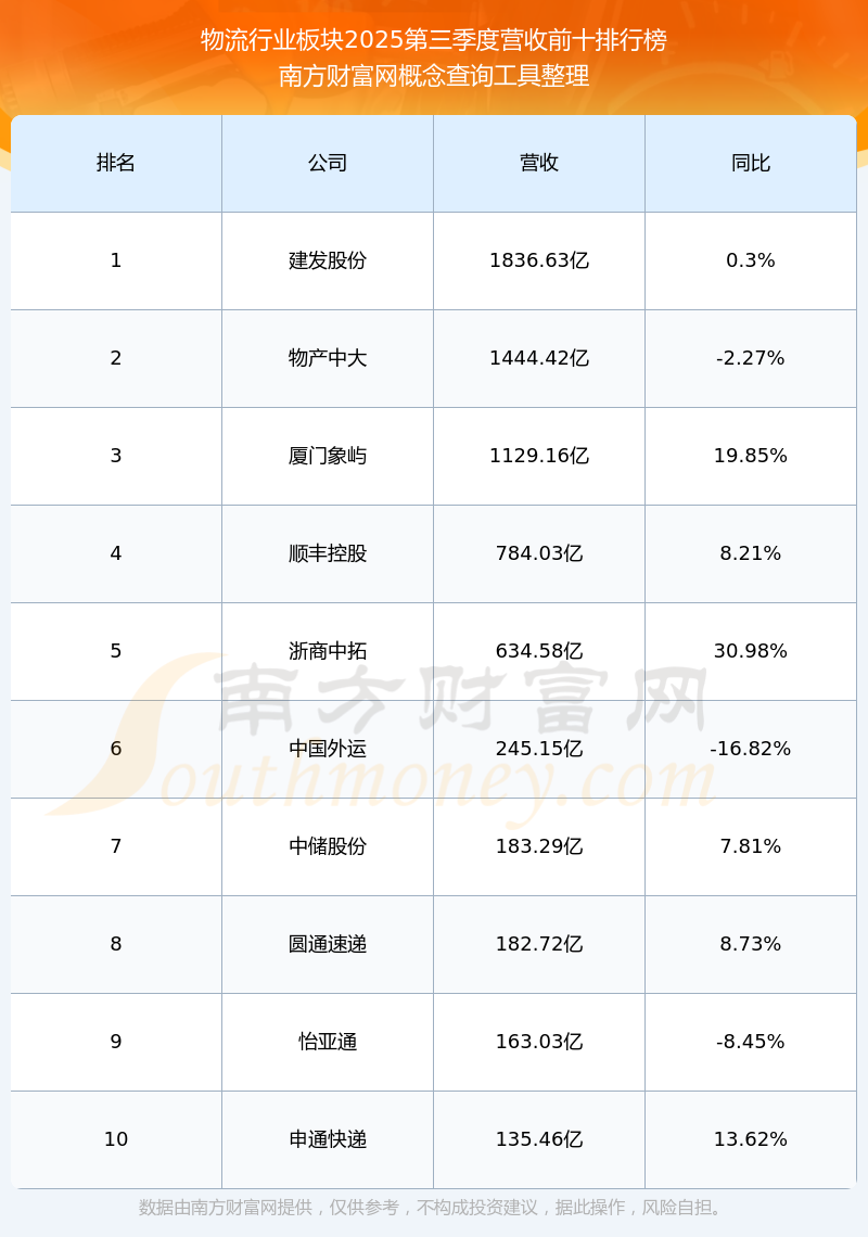 按照南方財(cái)富網(wǎng)概念查詢工具統(tǒng)計(jì),該股所屬板塊為物流行業(yè)板塊,該板塊共有57只股票,德邦股份2025第三季度營(yíng)收在該板塊中排名為第12名,該板塊2025第三季度營(yíng)收排名前十的股票如下表: