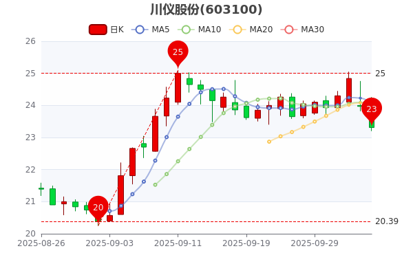 10月14日收盤(pán)消息,川儀股份(603100)股價(jià)報(bào)23.310元/股,跌1.42%。7日內(nèi)股價(jià)下跌3.17%,今年來(lái)漲幅上漲7.55%,成交總金額2.15億元,成交量908.29萬(wàn)手。