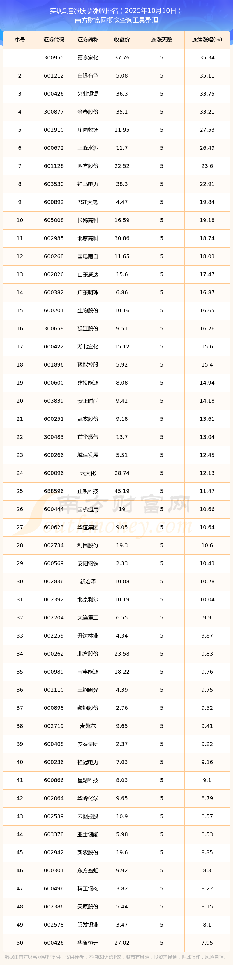 根據(jù)南方財(cái)富網(wǎng)概念查詢工具數(shù)據(jù)統(tǒng)計(jì),截止2025年10月10日收盤,共有116只個(gè)股實(shí)現(xiàn)5天連漲。其中連續(xù)漲幅較大的個(gè)股有嘉亨家化、白銀有色、興業(yè)銀錫等,連續(xù)漲幅分別為35.34%、35.11%、33.75%。