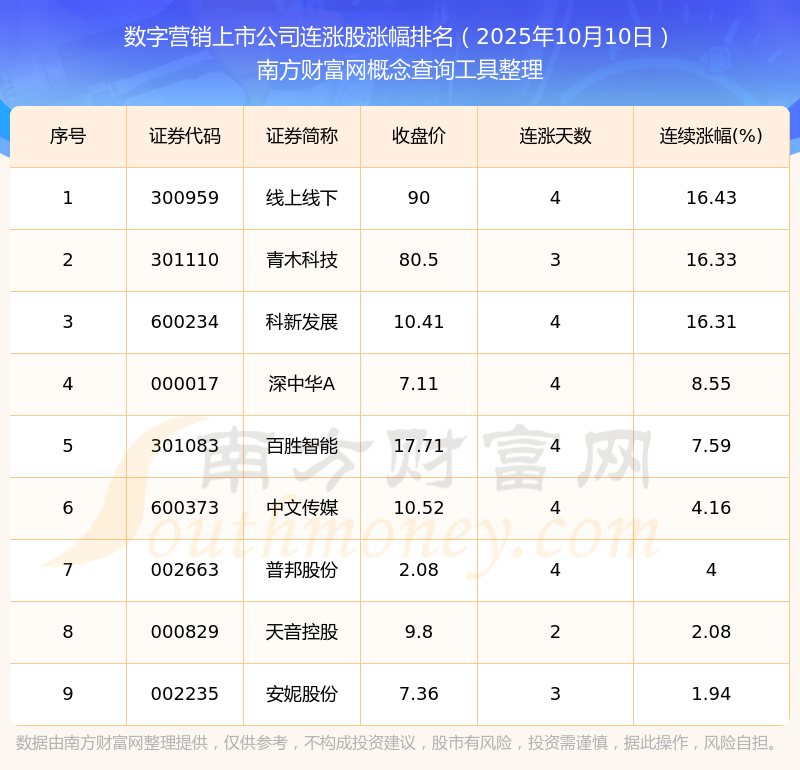 2025年10月10日數(shù)字營銷上市公司連漲股漲幅排名