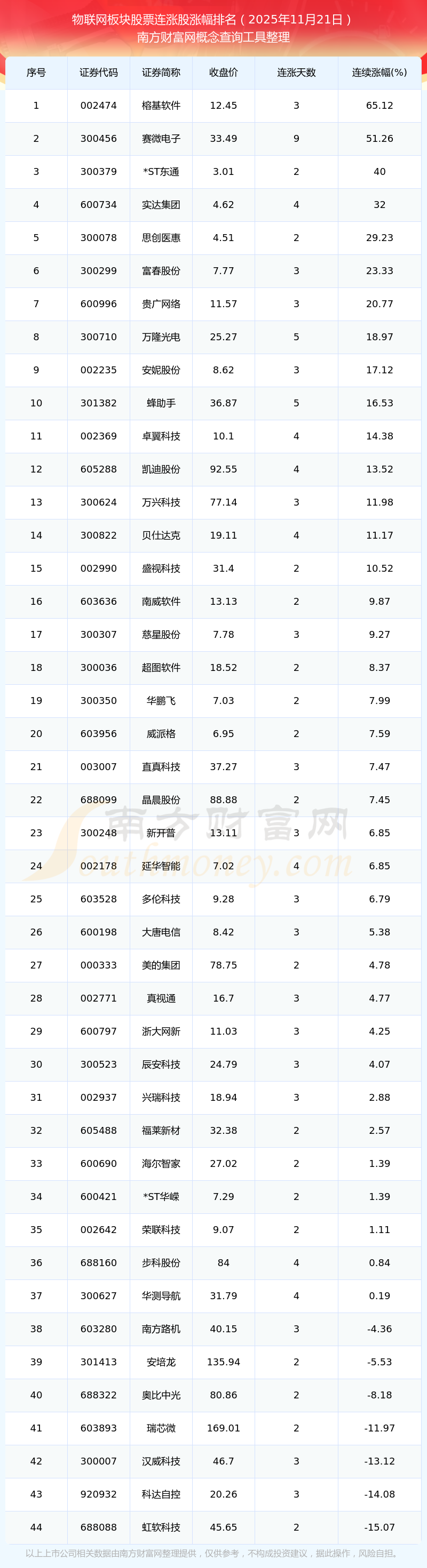 2025年11月21日物聯(lián)網(wǎng)板塊股票連漲股漲幅排名