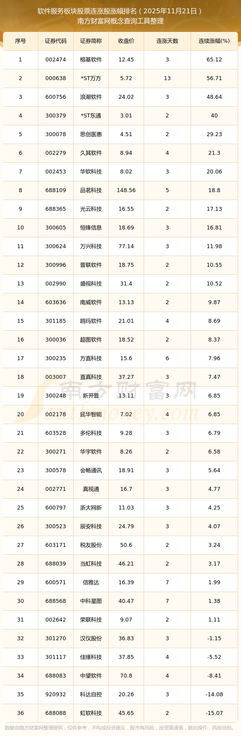 2025年11月21日軟件服務(wù)板塊股票連漲股漲幅排名