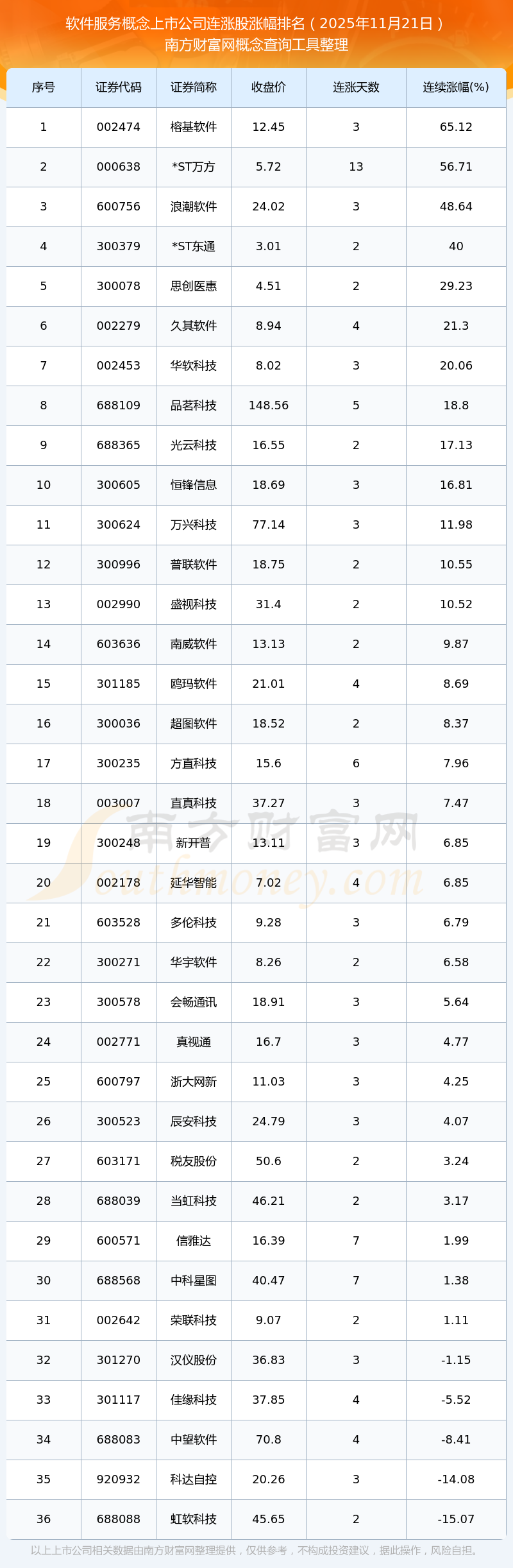 2025年11月21日軟件服務(wù)概念上市公司連漲股漲幅排名