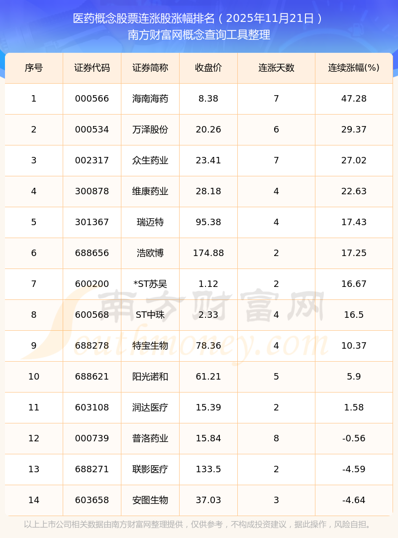 根據(jù)南方財(cái)富網(wǎng)概念查詢工具數(shù)據(jù)統(tǒng)計(jì),截止2025年11月21日收盤,醫(yī)藥概念股票共有14只個(gè)股實(shí)現(xiàn)連漲。其中連續(xù)漲幅較大的個(gè)股有海南海藥、萬澤股份、眾生藥業(yè)等,連續(xù)漲幅分別為47.28%、29.37%、27.02%。