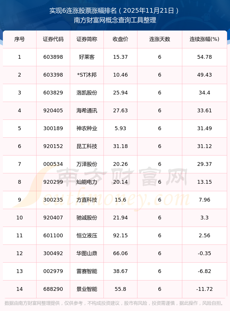 根據(jù)南方財(cái)富網(wǎng)概念查詢工具數(shù)據(jù)統(tǒng)計(jì),截止2025年11月21日收盤,共有14只個(gè)股實(shí)現(xiàn)6天連漲。其中連續(xù)漲幅較大的個(gè)股有好萊客、*ST沐邦、洛凱股份等,連續(xù)漲幅分別為54.78%、49.43%、34.40%。