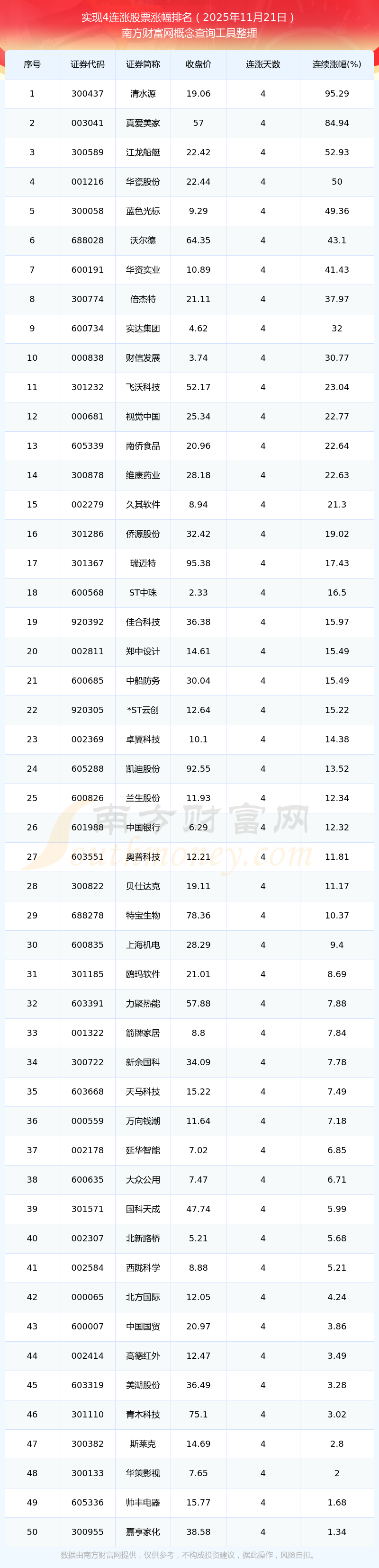 根據(jù)南方財(cái)富網(wǎng)概念查詢工具數(shù)據(jù)統(tǒng)計(jì),截止2025年11月21日收盤,共有65只個(gè)股實(shí)現(xiàn)4天連漲。其中連續(xù)漲幅較大的個(gè)股有清水源、真愛美家、江龍船艇等,連續(xù)漲幅分別為95.29%、84.94%、52.93%。