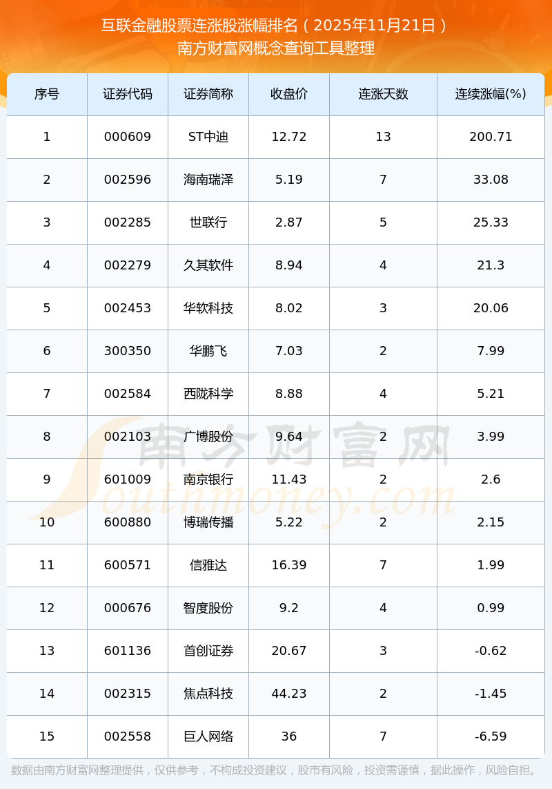 2025年11月21日互聯(lián)金融股票連漲股漲幅排名